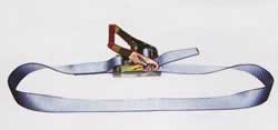 積荷商品の落下や荷崩れ防止の結束ベルト、ラチェット型強力タイプ。