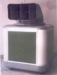 水が蒸発するとき、空気中の熱を奪っていく気化熱を利用する冷却方式です。4つのPADが四方に装着されております。PADは水の環境装置により常に濡れております。外の熱い空気は強力なファンの作用によりPADを通過する事になります。このとき水の蒸発作用に依って涼しくなるのです。こういった自然的、科学的又理論的な原理から開発されたものです。