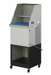 作業面には保護シート、吸引性能を上げる透明板、フード内に小物を置く棚(外すことはできません)、本体の下には、キャスター付き台を配置。