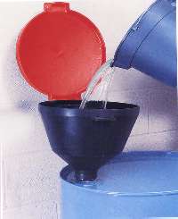 通気管つきファンネルは、このポリエチレンファンネルをおすすめします。通気の為に1.9cmの開口部を開ける必要はありません。ヒンジつきのフタ。廃液の分類に便利な3種類のカラーをご用意しました。