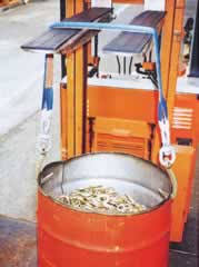 ●フォークリフトのフォークは滑りやすく危険です。ドラムアッパーのベルトがフォークに密着し、すべりにくく、ワイヤーやチェーンにくらべて安全性バツグン。